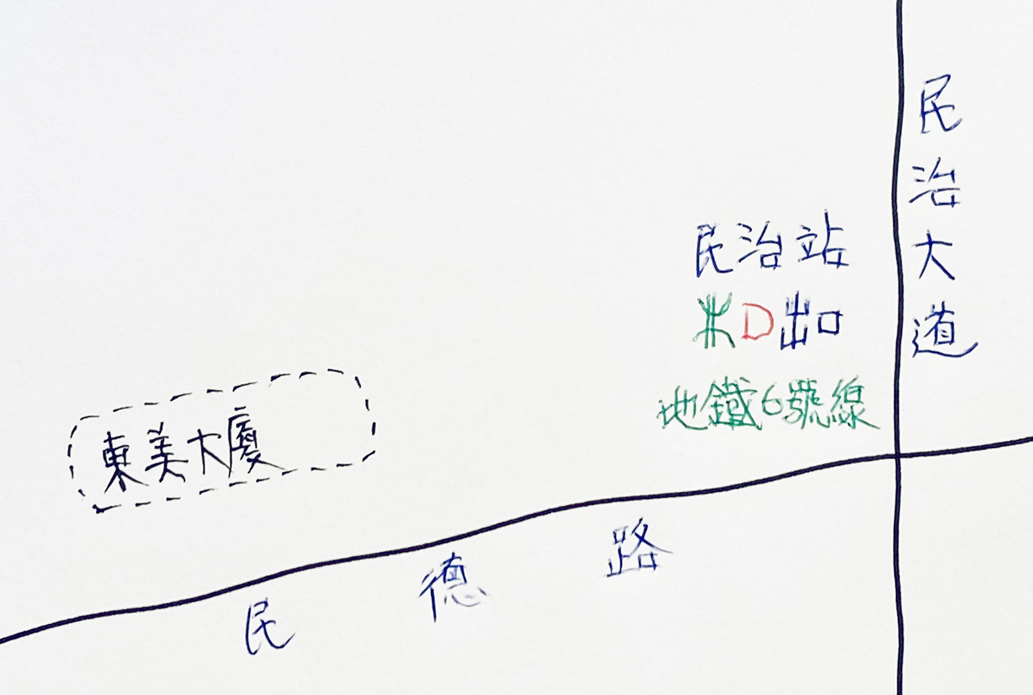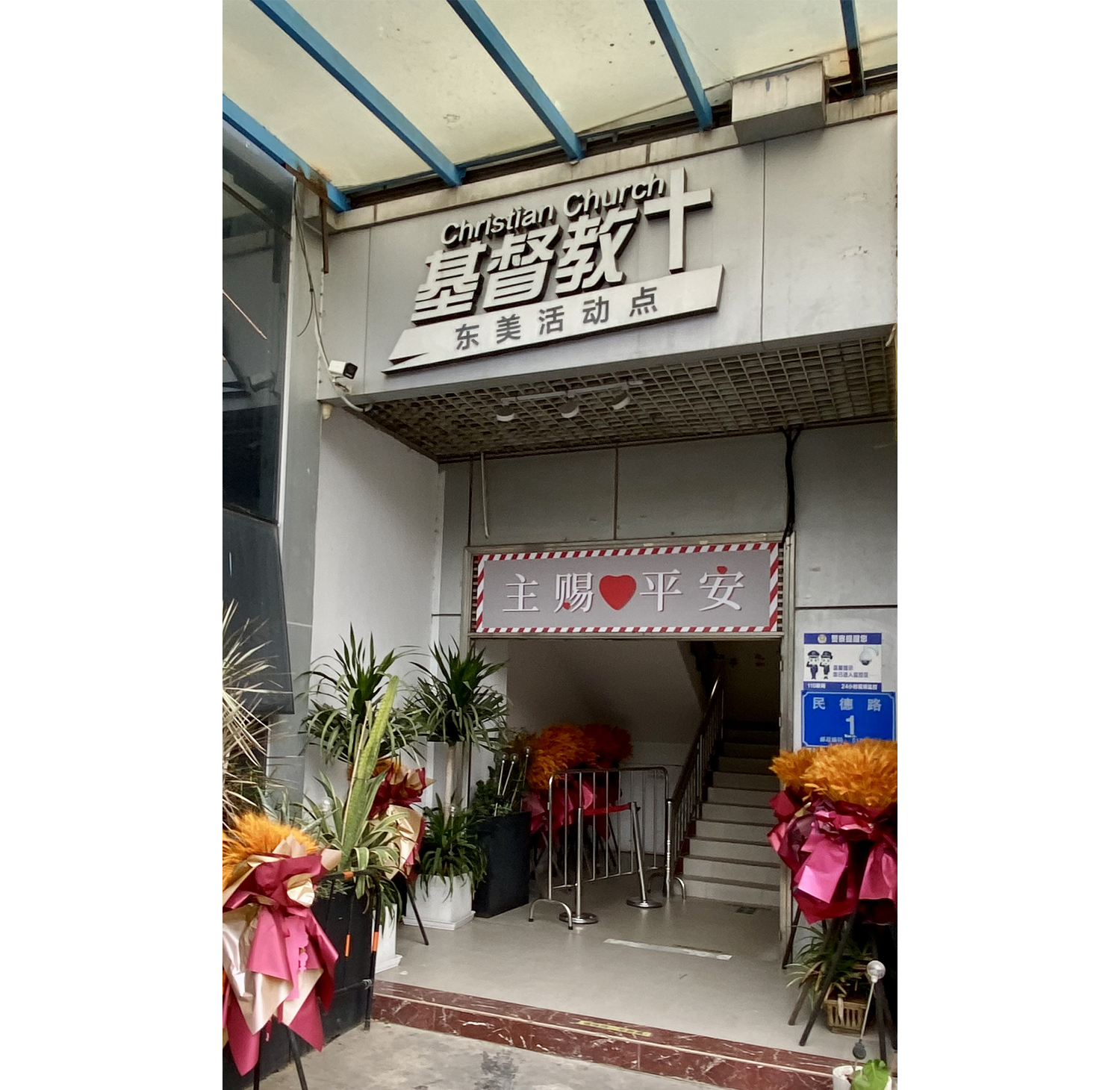 走上民治站D出口地面,旁邊是民治大道與民德路的交界處。沿民德路走不消五分鐘,眼前是一個小型停車場。在它的末端邊角處,可以看到不起眼的、卻又裝飾雅緻的、一棟東美大廈的入口。入口頂上置有大字招牌:「基督教東美活動點」。