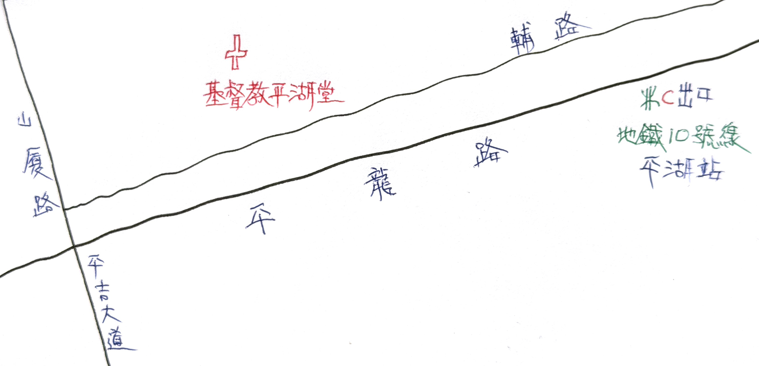由落馬州—福田岸入境深圳,到了口岸大樓的地面層,依隨着指引的路標,走出大樓,前去就在旁邊的地鐵10號線福田口岸站。這個是始發站,登上車廂都是對的行駛方向。由這裏乘坐二十二站,去到 平湖站;由C 出口上到地面,旁邊是平龍路。沿着平龍路的輔路走,大約十分鐘,眼前隔着一坪小型停車場望去,就見到一棟高豎十架的宏大教堂—「基督教平湖堂」。