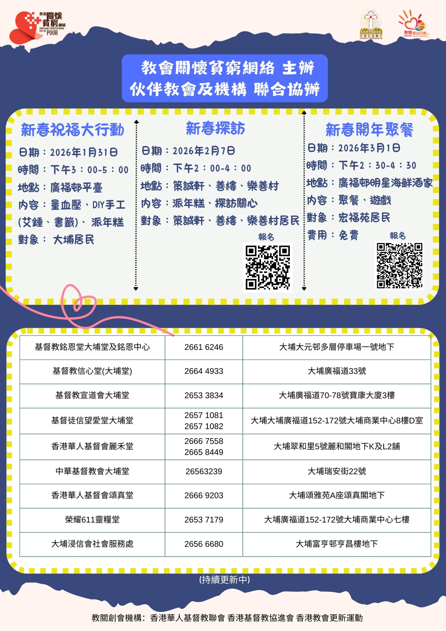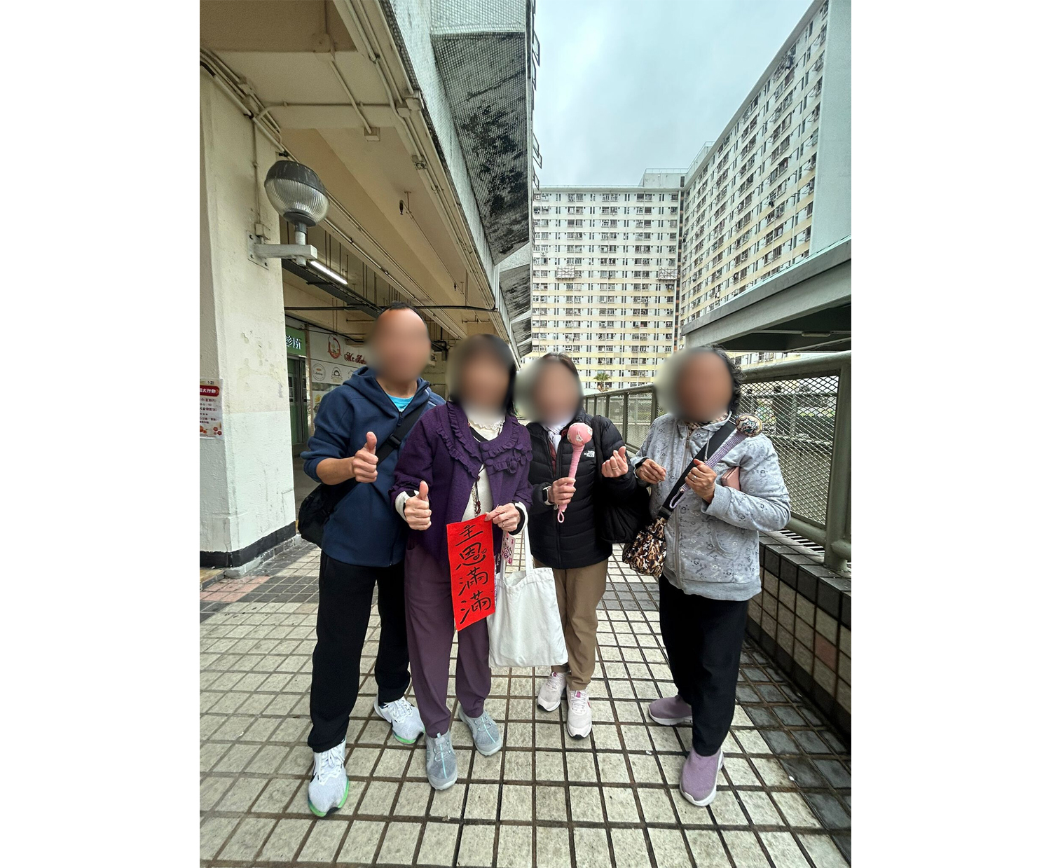 新春期間,我們策畫了一系列看似平凡的行動:在社區平台與街坊互動分享、走進過渡性房屋探訪、邀請居民一起吃一頓開年飯。這些行動並不追求規模或成效,而是希望讓教會在節期中,以自然、貼近的方式再次出現在社區生活之中,讓教會、宏福苑居民、大埔鄰舍可以連結在一起,建立互助的社區網絡;也讓宏福苑居民透過重新建立節日儀式感,找回生活的節奏。感恩新春關懷行動已有超過100位居民報名,並且有9間教會參與服侍。