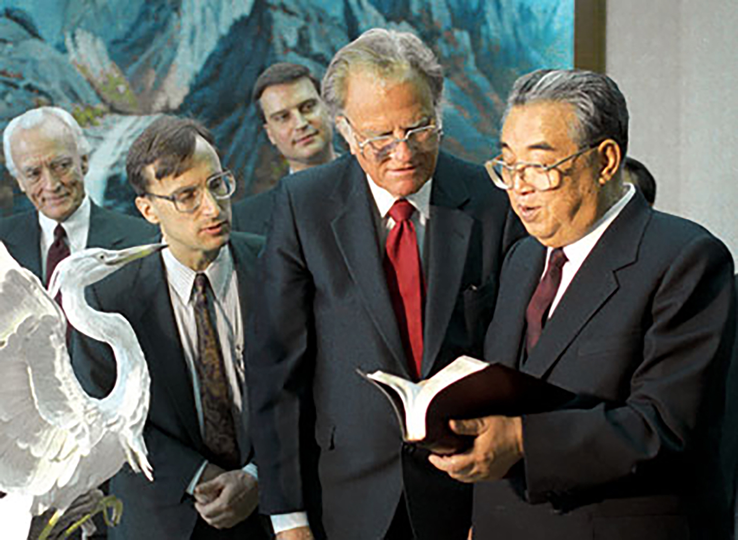 在平壤,葛培理牧師獲准在教會講道,(估計平壤只餘下兩三間教堂)。他也獲准在大學與學生對話交流。而最矚目的是:葛培理獲得國家最高領袖金日成主席接見!他倆不單進行了美好的交流對話,還很快建立了一份特別的友誼。葛培理更親自將一本《聖經》交到金日成手中,作為訪問的禮物。