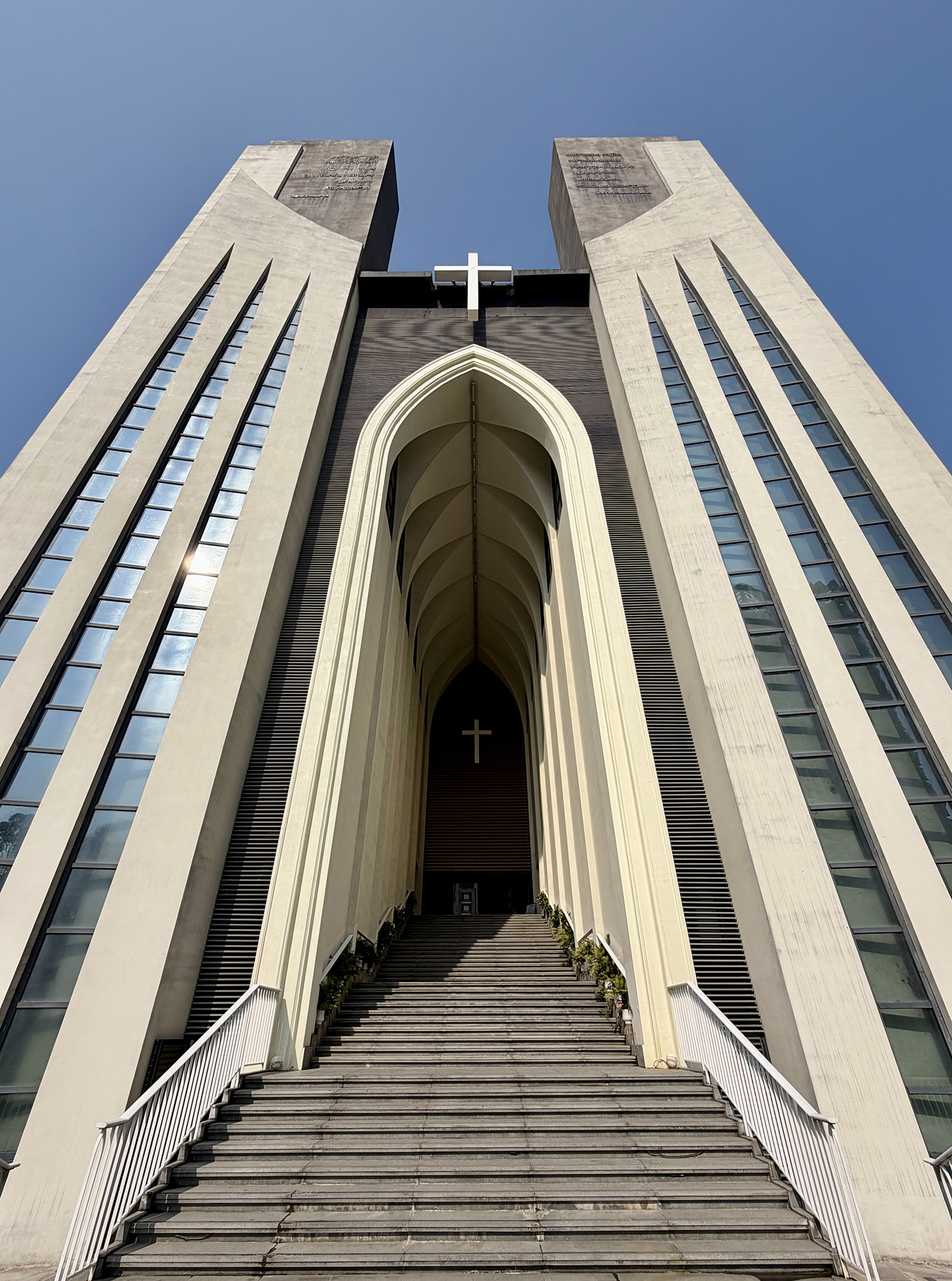 兩塔的頂端都綴上原文經句。一邊是希伯來文創世記二十八章十七節。「這真是神的殿,這是天的門!」(新漢語譯本,下同)。另一邊是希臘文約翰福音十章七、九節。「我是羊的門,我就是門。」兩塔之間的十架背下、分開遶着教堂的入口拱門,有吊下至台階地面的間條;象徵「雅各天梯」。天梯疊加十架,再次表徵由舊約時代到新約時代,上主一貫讓人親近祂。