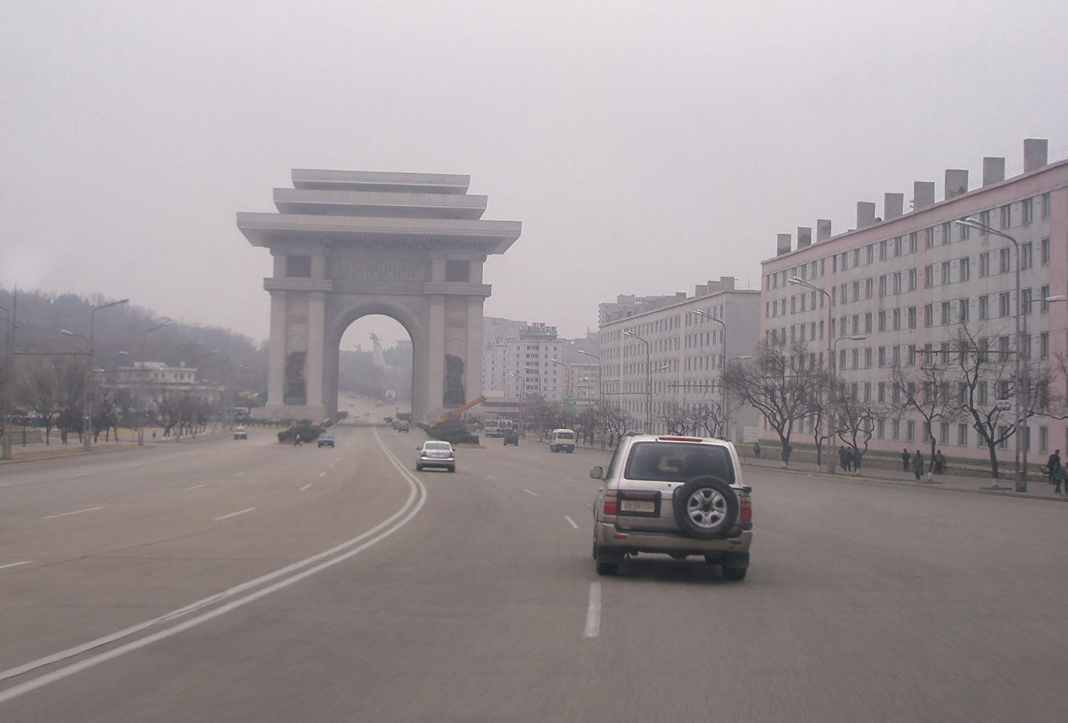 11月23日,平壤,雨。外邊下着雨,天氣再寒冷一點便會下雪,四圍的田野山嶺都是霧,低低的,有些厚、有些薄,很有詩意。我們坐上兩部Toyota Land Cruiser(豐田四驅越野車),向北面駛去。公路上,車輛比7年前多了,但仍是十分少。第一次見到雙層巴士,擠滿人的。