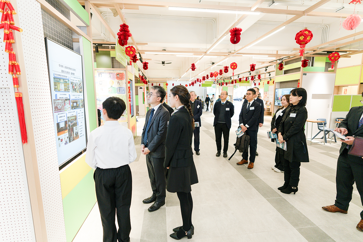 岑美怡副校長介紹「跨學科課程」的設計和特色,展示了多份學生優秀作品,體現學校在跨學科課程上的豐碩成果。學生亦向施副局長介紹了校內國民教育推行策略,包括如何透過課程優化,自然連繫校內校外活動以加強學生的家國情懷、民族自豪感、國民身分認同及國家安全意識。梁國強副校長隨後與泳隊學生介紹學校的泳池規格、游泳課程及訓練點滴,展現學生自信一面。