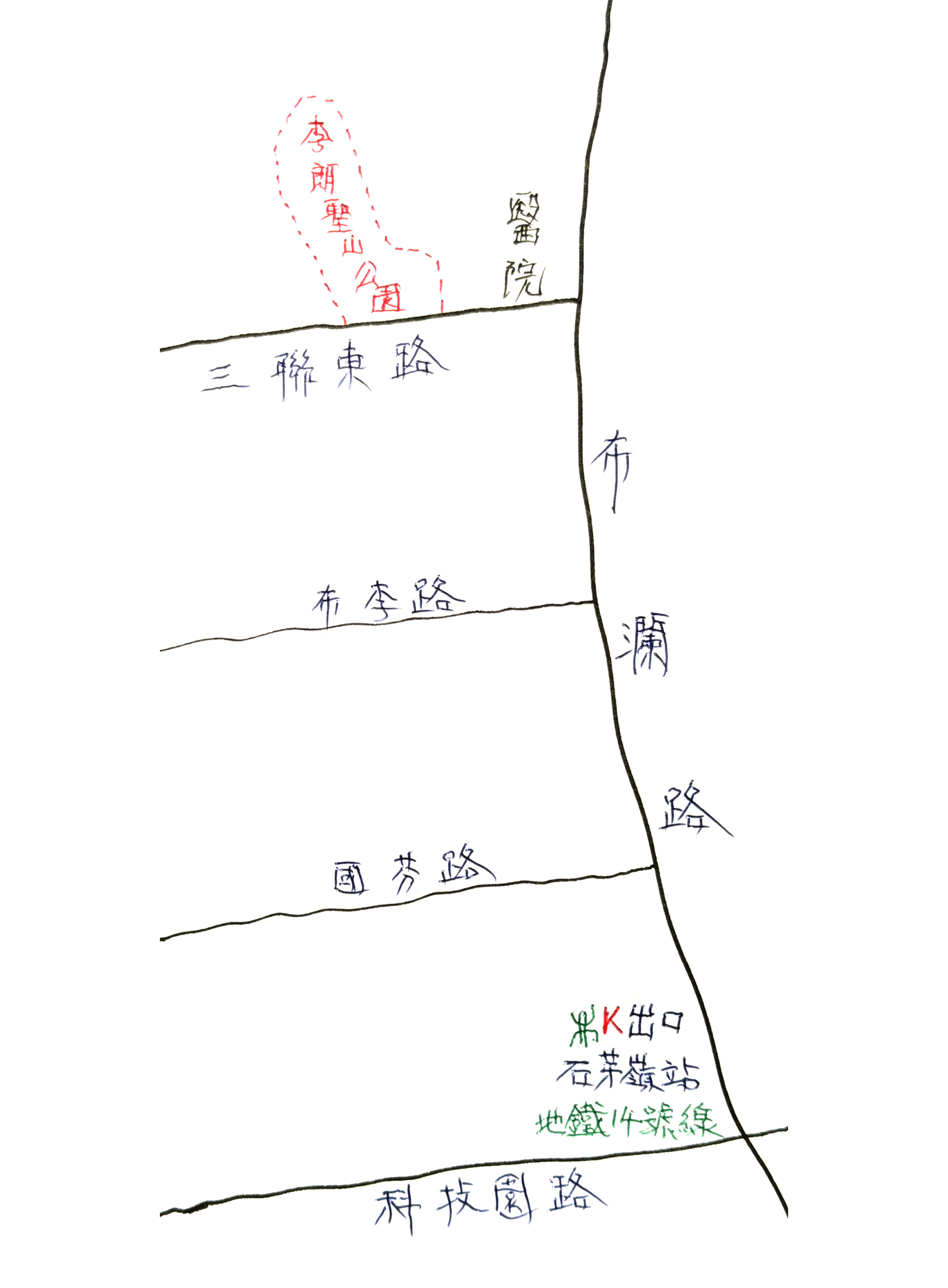 由石芽嶺站K出口走上地面,旁邊是布瀾路。依着本文附圖所示走,大約20分鐘步程,到達三聯東路;在這個交界處矗立一所甚具規模的醫院。在貼傍醫院的三聯東路上,眼前竟見一座高大的石建船首,舷上刻着「李朗聖山公園」名稱,還有鴿子唅住枝葉的圖象。